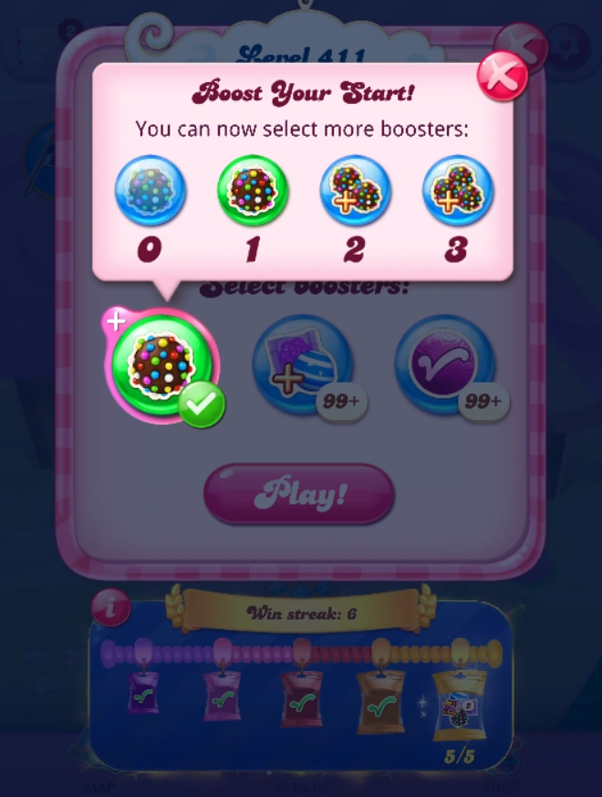 On 16 May 2024, the players can boost a booster they wish to use by gaining the number of items in the selected booster. The booster will have a small plus with a pink circle. When clicking on the plus sign, they can choose the number of items to make more boosters appear with the same number in the level.