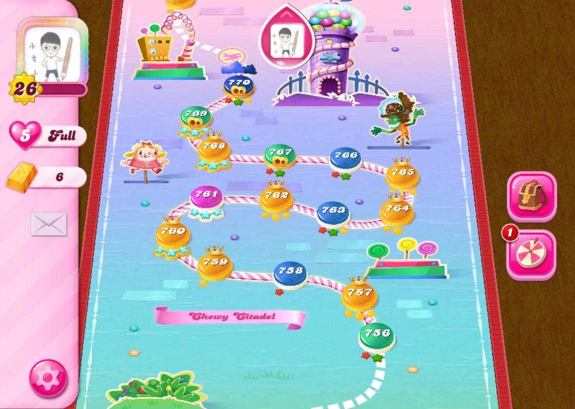 Chewy Citadel is a very hard episode, with a mean of 5.53. It has one hard level: 757, three extremely hard levels: 760, 762, and 770, and four nearly impossible levels: 759, 764, 767, and 769. All other levels are rated somewhat easy or below. Overall, it is much easier than the previous episode, Marmalade Meadow.