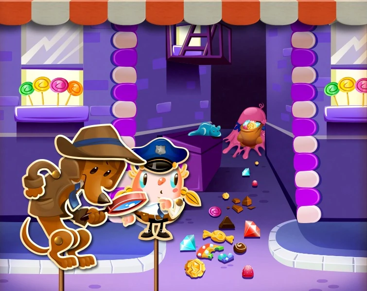 - This episode bears several similarities to Nougat Noir. Both episodes take place in similar locations (at night), have purple banners/pathways, the same characters and a very similar story (the Bubblegum Troll has stolen something and Tiffi and Doxen Cooper investigate), have candy order levels that share a particular theme (Nougat Noir's candy order levels all require colour bombs, this episode's candy order levels all require special candy combinations) and both episodes have 9 jelly levels (as well as the first level being a jelly level in both episodes). They are also very close in difficulty.