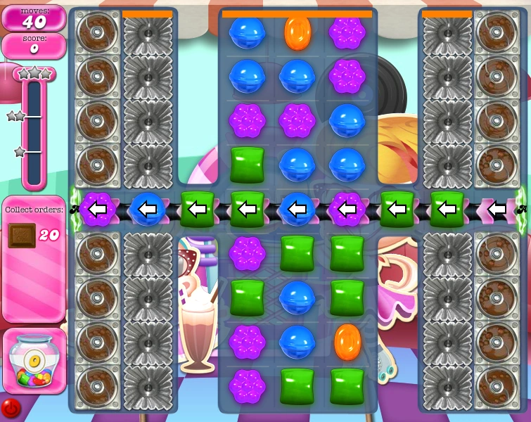 - Since chocolate cannot spread to the conveyor belt, there will only be a maximum of four chocolate squares on each side where the chocolate spawners are if all the one-layered frosting are cleared. This gives a maximum total of 16 chocolate squares on the board at once if they are left uninterrupted.