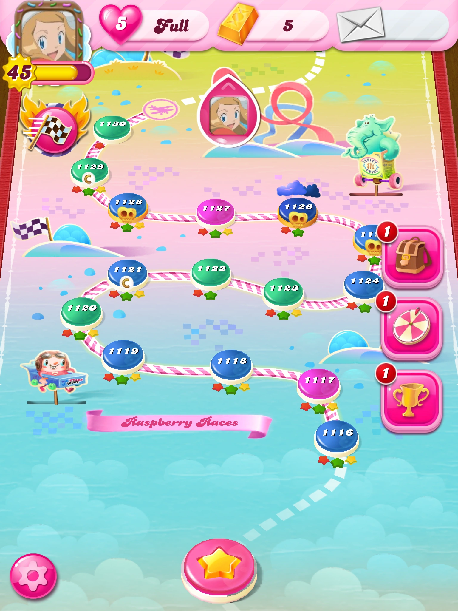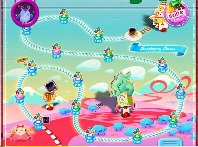 Raspberry Races is a very hard episode, with a mean of 5.07. It has two somewhat hard - hard levels: 1116 and 1129, two very hard levels: 1117 and 1121, one extremely hard level: 1128, one nearly impossible level: 1125, and one variable level: 1123. As a result, this episode is easier the previous episode, Chocolate Chamber.