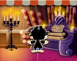 Tiffi gets out an electronic keyboard while disco lights swirl around the room. The organist becomes happy, and reveals funky clothing and dances to the music.