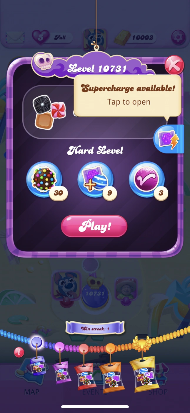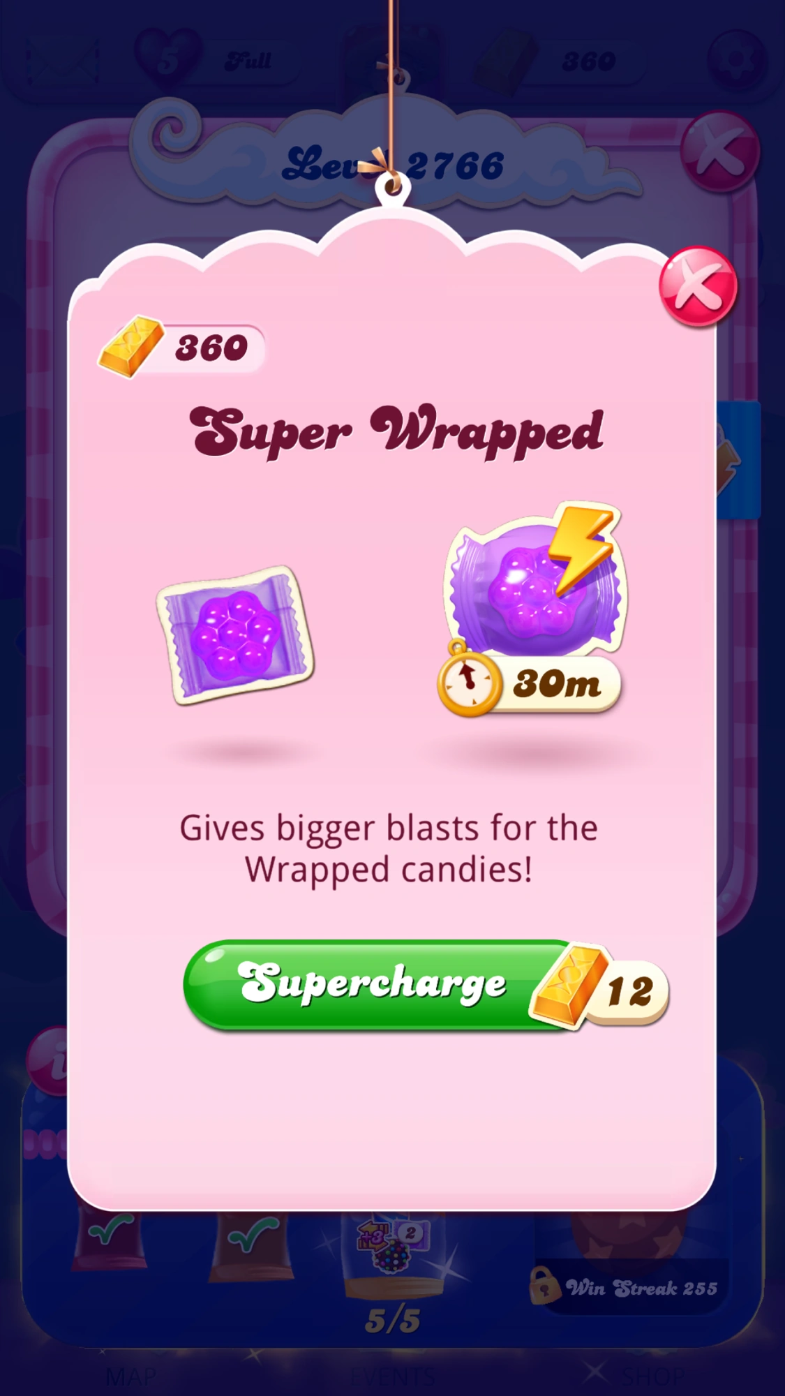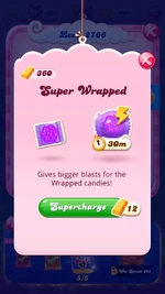 Starting from 5 April 2024, Super Wrapped, a booster that "supercharges" the Wrapped Candy in order to make bigger blasts was made available. When available, this booster appears at the right side of the level select screen.
